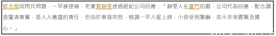 据悉当天执法人员一大早直接在修杰楷家把他上铐带走,贾静雯因为在厦门拍戏而不在家中,得知此事之后,通过经纪公司回应称,“配合调查厘清事实,是人人应尽的责任”。